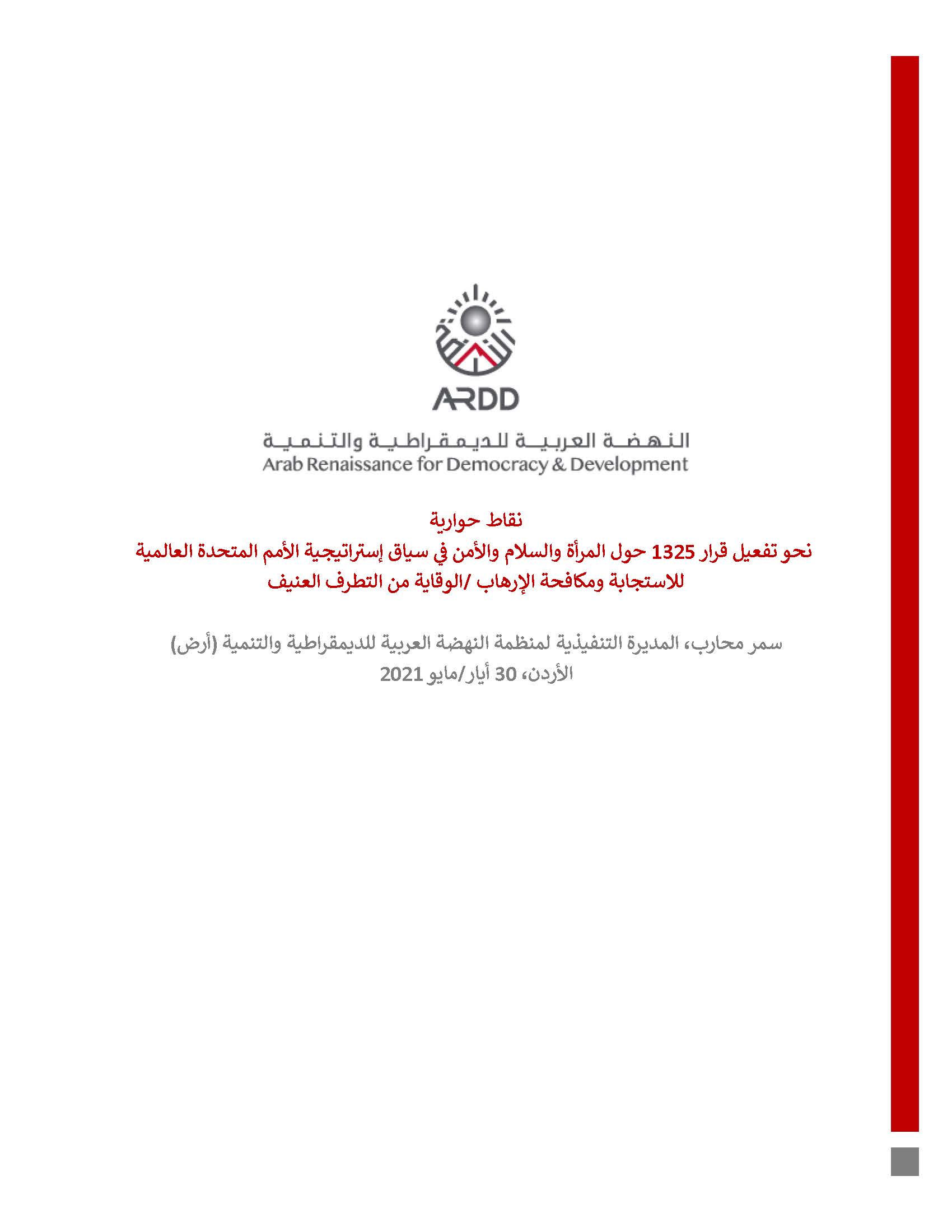 28/06/22نقاط حوارية نحو تفعيل قرار 1325 حول المرأة والسلام والأمن في سياق إستراتيجية الأمم المتحدة العالمية للاستجابة ومكافحة الإرهاب /الوقاية من التطرف العنيف قدمتها المديرة التنفيذية لمنظمة النهضة (أرض)، سمر محارب