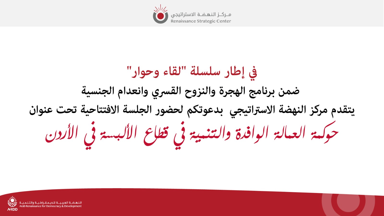 يتقدم مركز النهضة الاستراتيجي بدعوتكم لحضور الجلسة الافتتاحية تحت عنوان