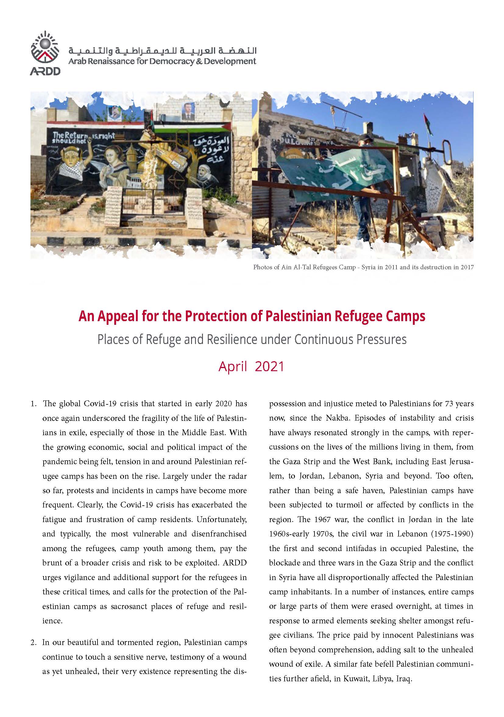 05/04/21An Appeal for the Protection of Palestinian Refugee Camps Places of Refuge and Resilience under Continuous Pressures