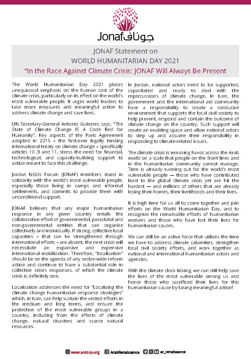 18/08/21JONAF Statement on World Humanitarian Day 2021 “In the Race Against Climate Crisis: JONAF Will Always Be Present”