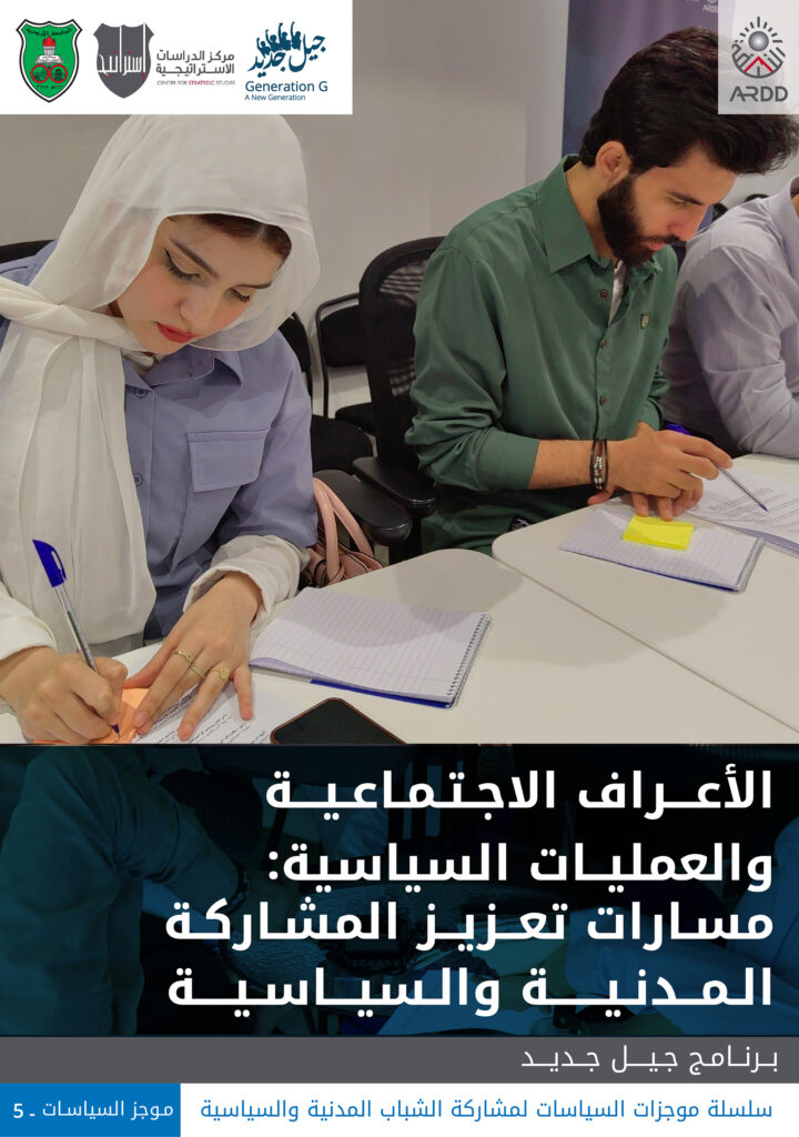 ينبثق هذا الموجز عن مختبر سياسات مشاركة الشباب المدنية والسياسية، الذي نظمته منظمة النهضة العربية للديمقراطية والتنمية (أرض) بالشراكة مع مركز الدراسات الإستراتيجية في الجامعة الأردنية، ضمن برنامج “جيل جديد”، كما يسلط الضوء على الجلسة الخامسة من المختبر التي حملت عنوان “الأعراف الاجتماعية والعمليات السياسية: مسارات تعزيز المشاركة المدنية والسياسية”، والتي ناقش خلالها عشرون طالبة وطالبًا من قسمي العلوم السياسية والقانون في الجامعة الأردنية هذه القضية. وفقًا للمنهجية التي يتبعها المختبر، استضافت الجلسة دينا البشير، المحامية وعضو مجلس النواب الأردني، وأدارها الدكتور إبراهيم العدرة، المحاضر في قسم العمل الاجتماعي بكلية الآداب في الجامعة الأردنية.