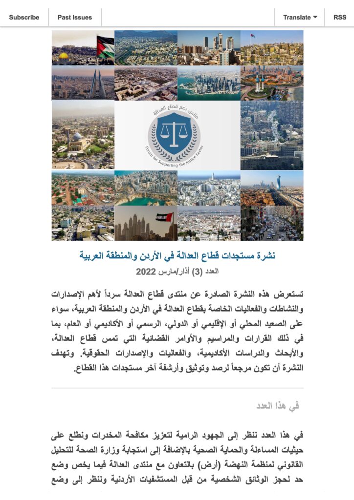 في هذا العدد ننظر إلى الجهود الرامية لتعزيز مكافحة المخدرات ونطلع على حيثيات المساءلة والحماية الصحية بالإضافة إلى استجابة وزارة الصحة للتحليل القانوني لمنظمة النهضة (أرض) بالتعاون مع منتدى العدالة فيما يخص وضع حد لحجز الوثائق الشخصية من قبل المستشفيات الأردنية وننظر إلى وضع حماية الطفل في الأردن والتطورات على مشروع قانون الطفل. وفي فلسطين، ما تزال الانتهاكات الإسرائيلية تتصدر التقارير العالمية وآخرها تقرير منظمة العفو الدولية.