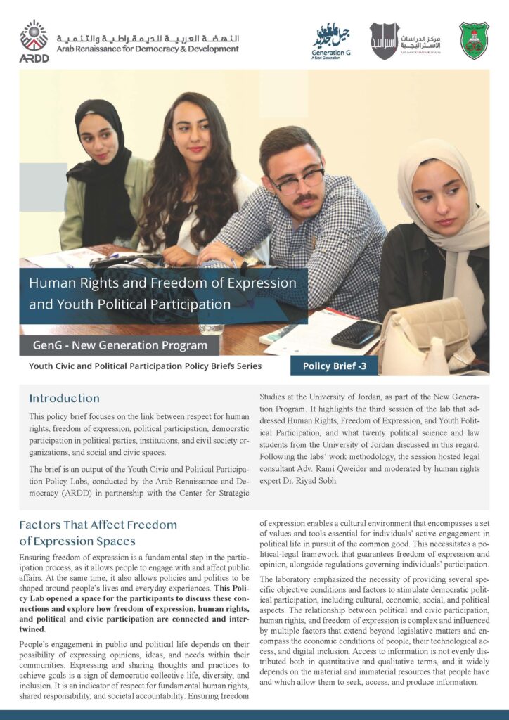 The brief is an output of the Youth Civic and Political Participation Policy Labs, conducted by the Arab Renaissance and Democracy (ARDD) in partnership with the Center for Strategic Studies at the University of Jordan, as part of the New Generation Program. It highlights the third session of the lab that addressed Human Rights, Freedom of Expression, and Youth Political Participation, and what twenty political science and law students from the University of Jordan discussed in this regard. Following the labs´ work methodology, the session hosted legal consultant Adv. Rami Qweider and moderated by human rights expert Dr. Riyad Sobh.