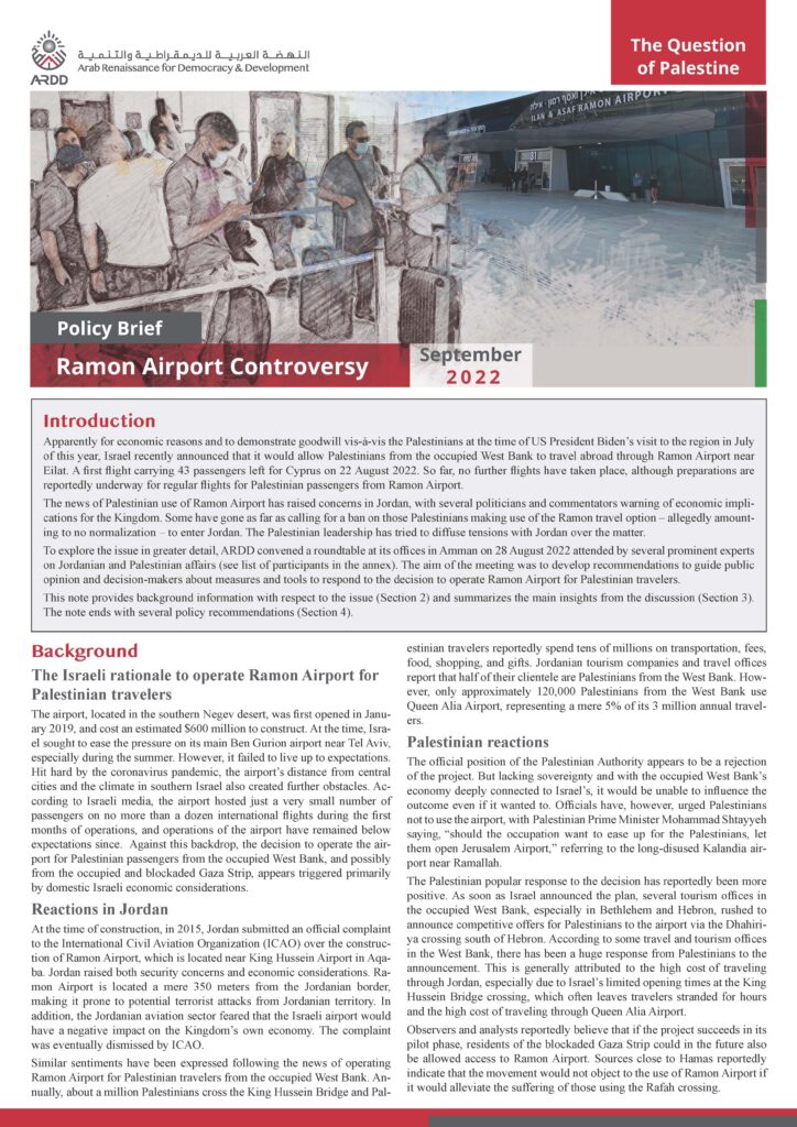 To explore the issue in greater detail, ARDD convened a roundtable at its offices in Amman on 28 August 2022 attended by several prominent experts on Jordanian and Palestinian affairs (see list of participants in the annex). The aim of the meeting was to develop recommendations to guide public opinion and decision-makers about measures and tools to respond to the decision to operate Ramon Airport for Palestinian travelers.