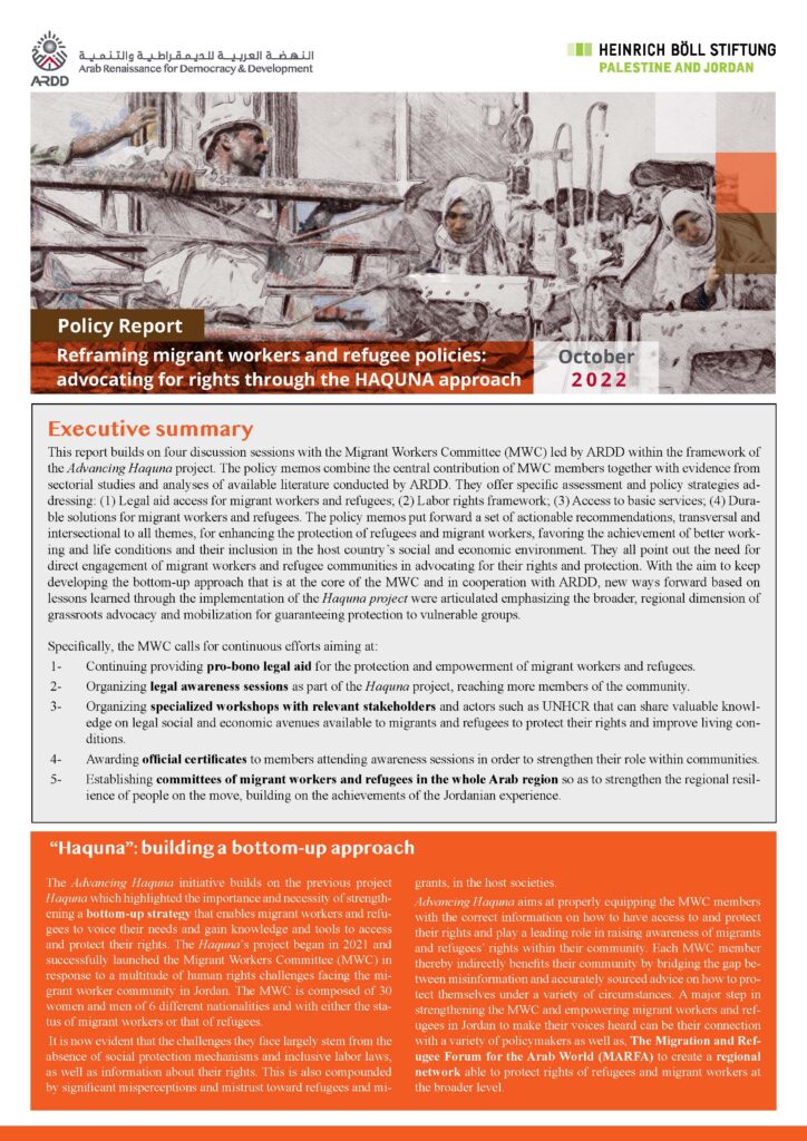 This report builds on four discussion sessions with the Migrant Workers Committee (MWC) led by ARDD within the framework of the Advancing Haquna project. The policy memos combine the central contribution of MWC members together with evidence from sectorial studies and analyses of available literature conducted by ARDD. They offer specific assessment and policy strategies addressing: