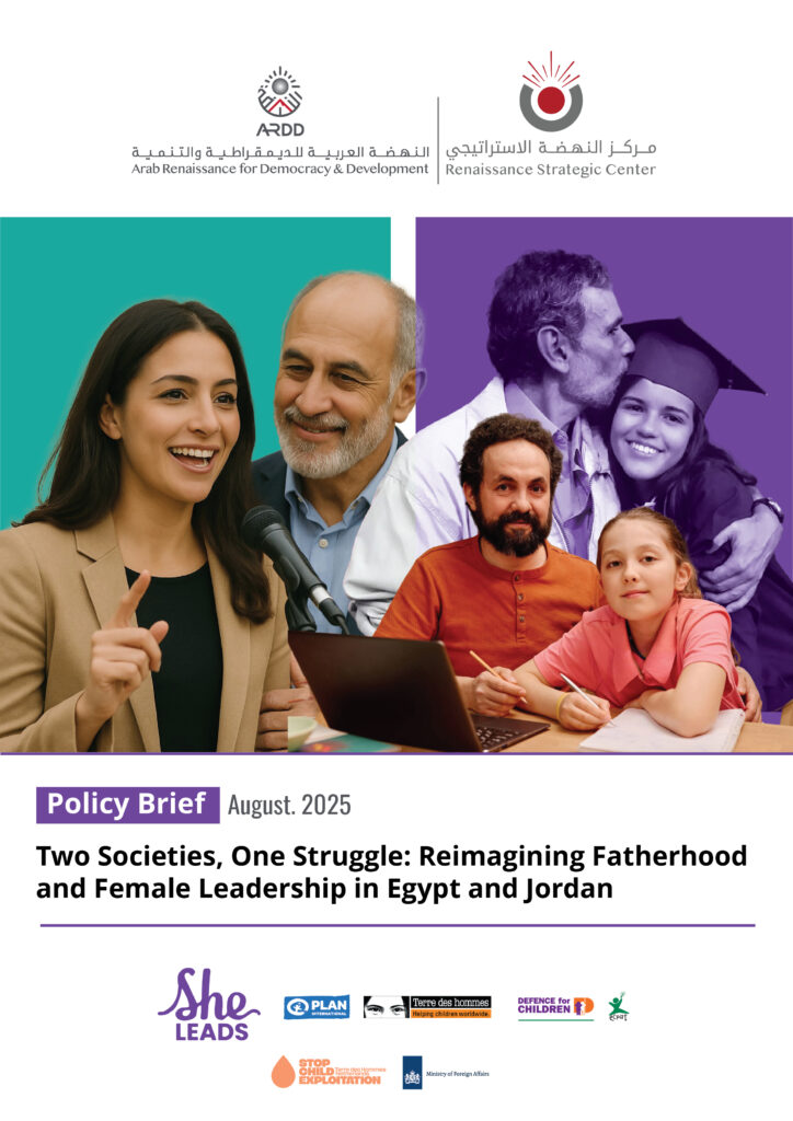 This policy brief examines how evolving family dynamics—particularly the roles of fathers and male relatives—are shaping young women’s access to leadership in both countries. It draws on insights from bilateral consultations with gender and leadership experts convened by ARDD between April and June 2025 under the “She Leads” program. These consultations reflect a growing recognition that gender equality in the Arab world cannot be achieved without rethinking how family and fatherhood are understood and practiced.