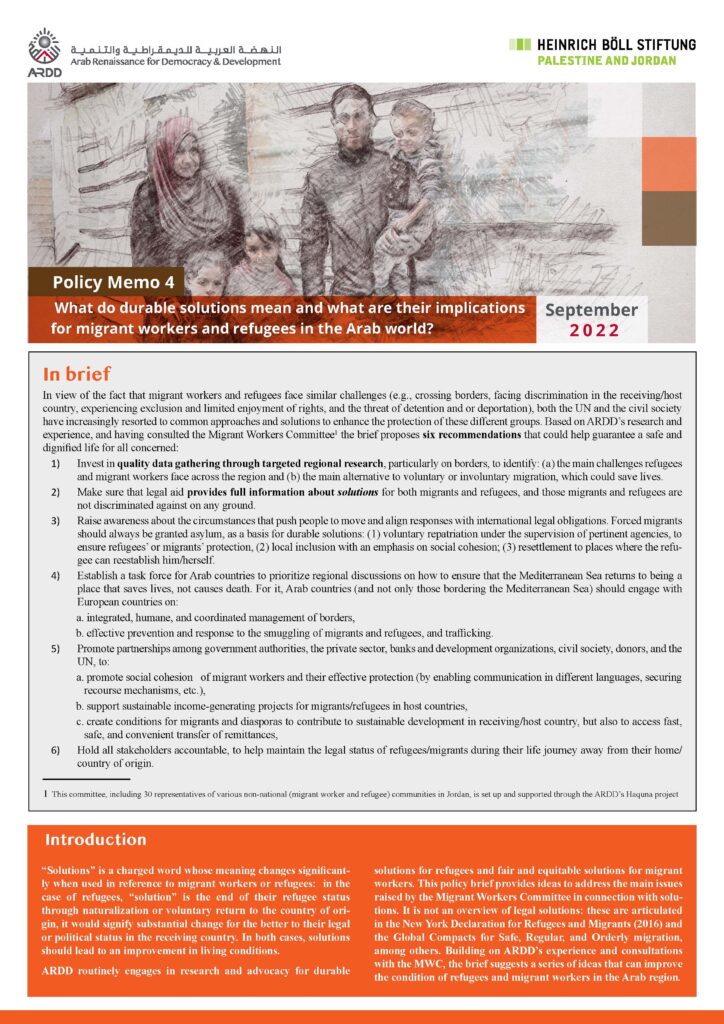 In view of the fact that migrant workers and refugees face similar challenges (e.g., crossing borders, facing discrimination in the receiving/host country, experiencing exclusion and limited enjoyment of rights, and the threat of detention and or deportation), both the UN and the civil society have increasingly resorted to common approaches and solutions to enhance the protection of these different groups. Based on ARDD’s research and experience, and having consulted the Migrant Workers Committee1 the brief proposes six recommendations that could help guarantee a safe and