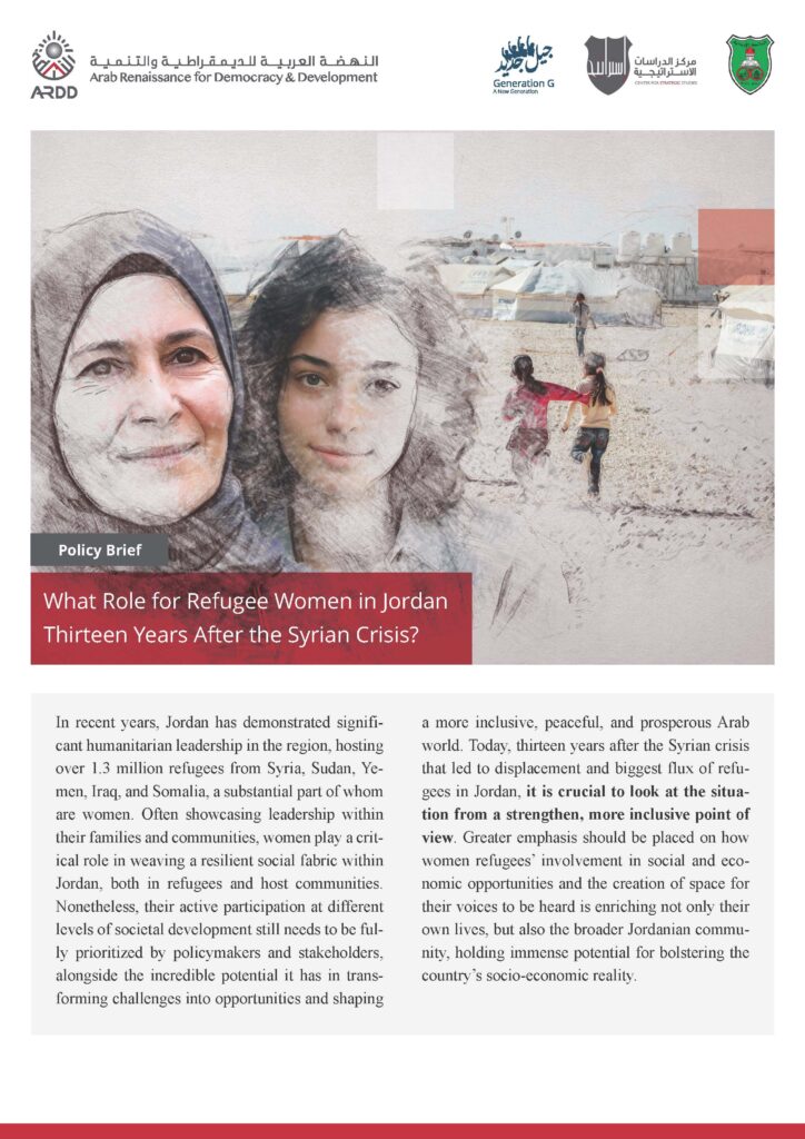 In recent years, Jordan has demonstrated significant humanitarian leadership in the region, hosting over 1.3 million refugees from Syria, Sudan, Yemen, Iraq, and Somalia, a substantial part of whom are women. Often showcasing leadership within their families and communities, women play a critical role in weaving a resilient social fabric within Jordan, both in refugees and host communities. Nonetheless, their active participation at different levels of societal development still needs to be fully prioritized by policymakers and stakeholders, alongside the incredible potential it has in transforming challenges into opportunities and shaping a more inclusive, peaceful, and prosperous Arab world. Today, thirteen years after the Syrian crisis that led to displacement and biggest flux of refugees in Jordan, it is crucial to look at the situation from a strengthen, more inclusive point of view. Greater emphasis should be placed on how women refugees’ involvement in social and economic opportunities and the creation of space for their voices to be heard is enriching not only their own lives, but also the broader Jordanian community, holding immense potential for bolstering the country’s socio-economic reality.